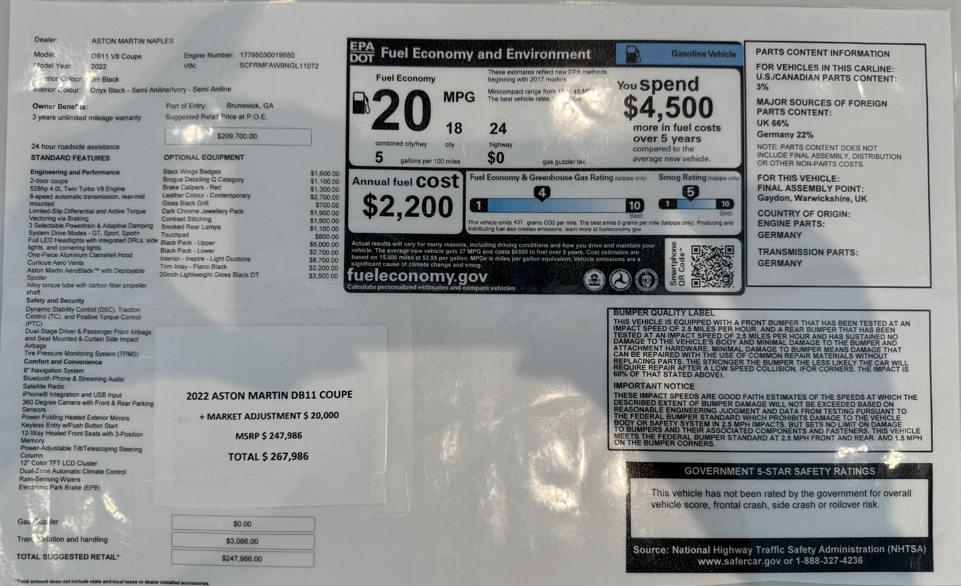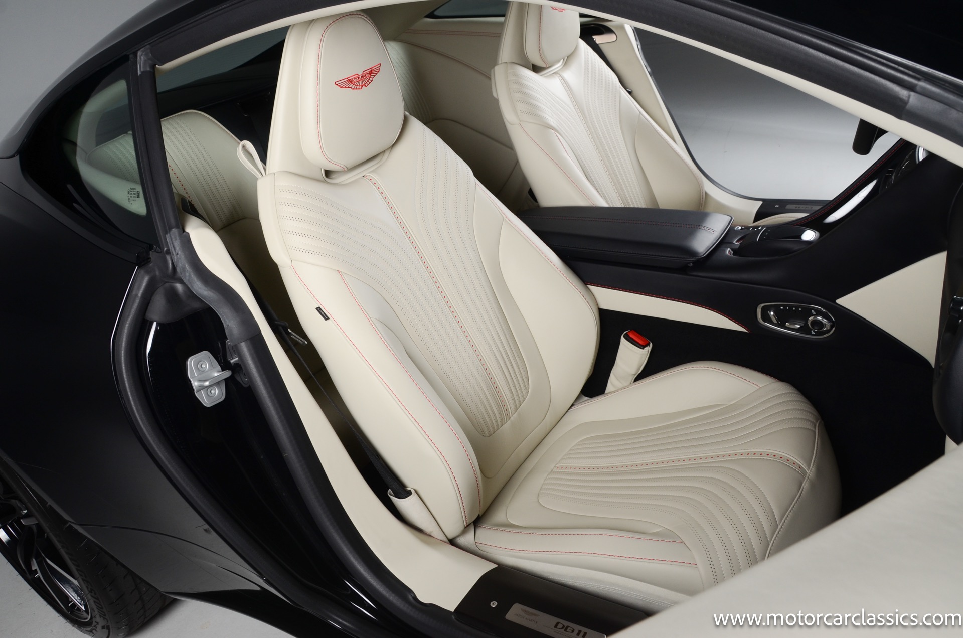 2022 Aston Martin DB11 V8 Coupe for sale! Motorcar Classics is pleased to offer this stunning DB11 presented in Jet Black with Onyx Black interior and Semi Aniline/Ivory. 528 HP 4.0L twin turbo V8 engine. 8-speed automatic transmission. With only 749 1-owner accident free miles this car is in mint condition. Options include: Black wings badges, brogue detailing Q category, red brake calipers, contemporary leather colour, gloss black grill, dark chrome jewelry pack, contrast stitching, smoked rear lamps, touchpad, black pack upper & lower, light duotone interior inspire, piano black trim inlay, 20 inch lightweight gloss black DT wheels and more! $267,986 market adjustment MSRP!