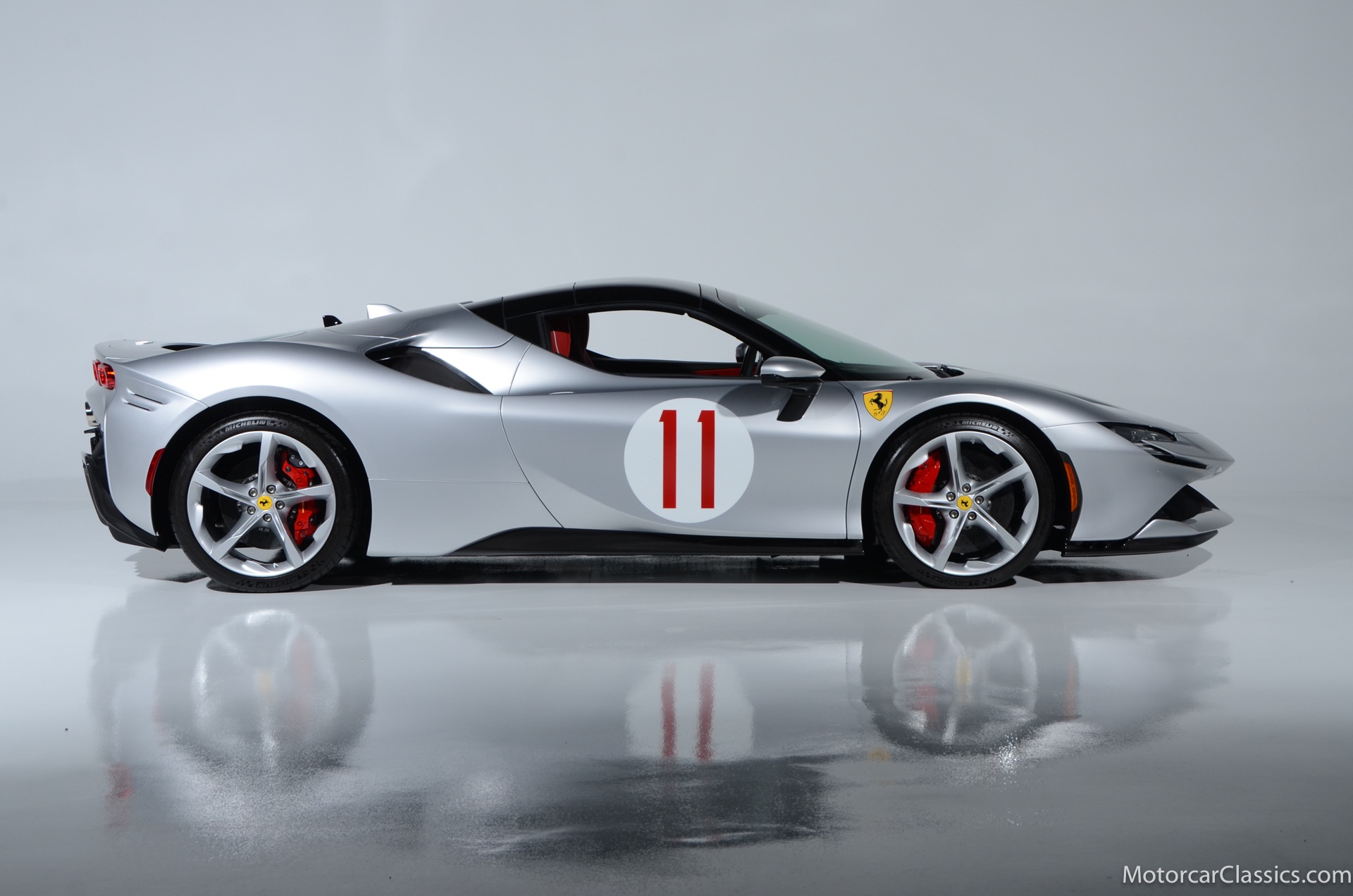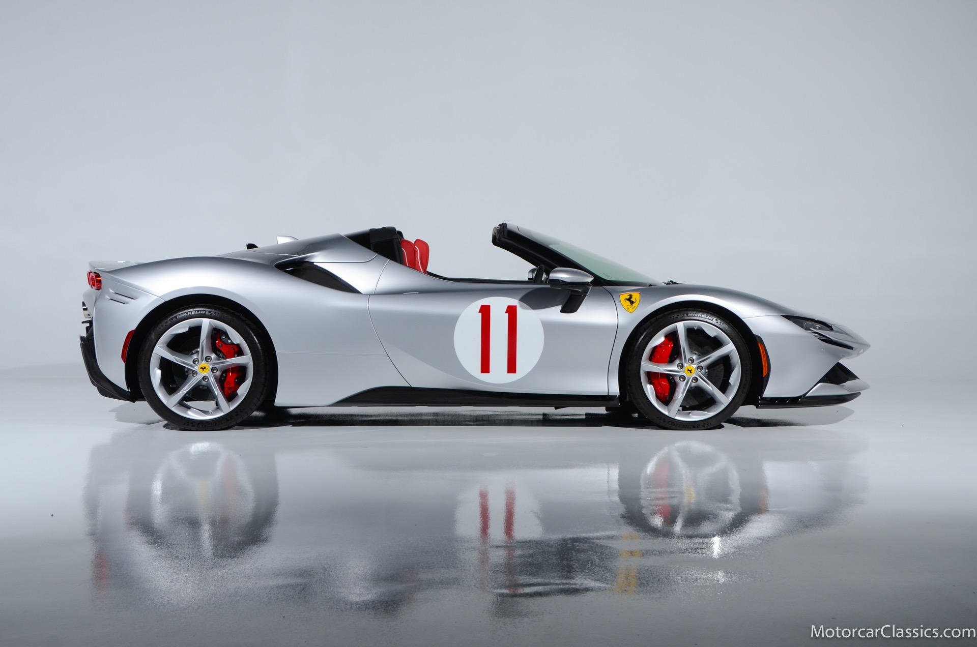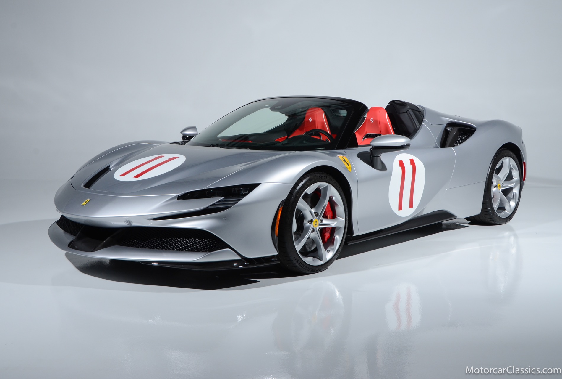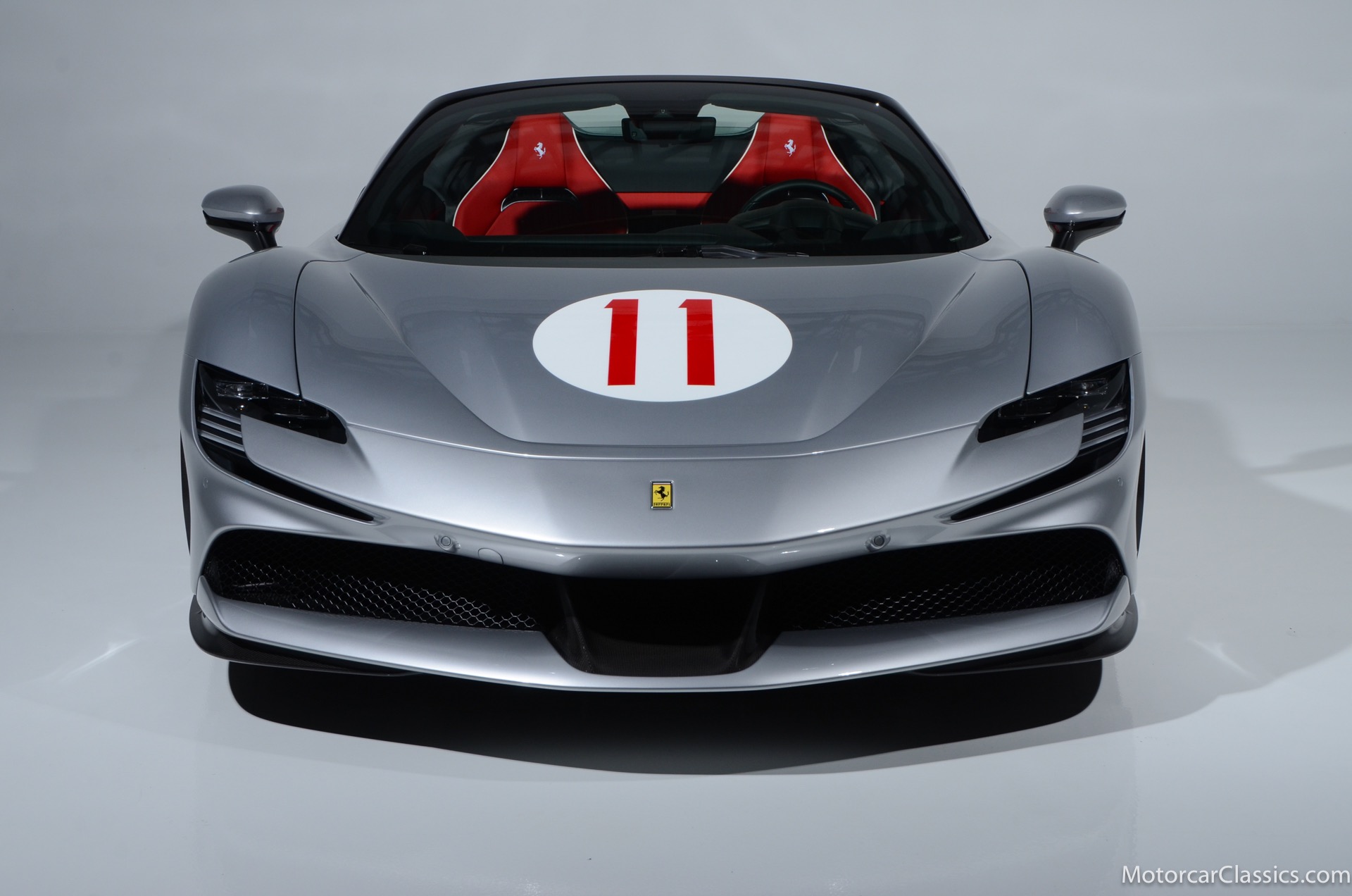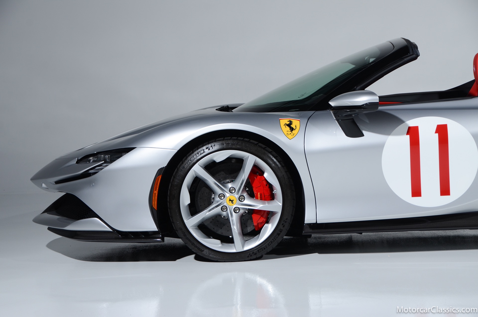 2022 Ferrari SF90 Spider for sale! Motorcar Classics is proud to present this one-of-one Tailor Made 2022 Ferrari SF90 Spider. This particular SF90 was tailored after the 1957 Ferrari 625 TRC and modeled to chassis number 0672MDTR. Finished in Argento Nurburgring with Biano white livery circles that go across the hood and both doors with the number 11. The interior is covered in Red leather with white piping and black accents. Behind the driver's seat is the 986HP Twin Turbo 3.9l V8 e4WD PHEV attached to a 8 speed F1 Dual clutch transmission with only 190 miles driven since new. Option include: AFS System America, Airbrushed logo, 2 side circles for livery, Back radar, Red brake calipers, Carbon fibre side air splitters, Carbon Fibre engine cover, Carbon fibre rear boot trim, Carbon fibre rear diffuser, Carbon fibre under door cover, Exterior sill kick in carbon, Suspension lift and an additional $108,760.00 in other options ( See photos with under hood plaque) Your Inspection is invited!