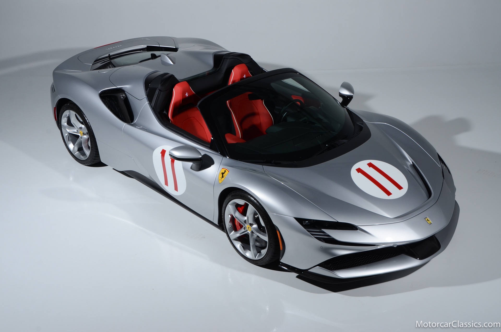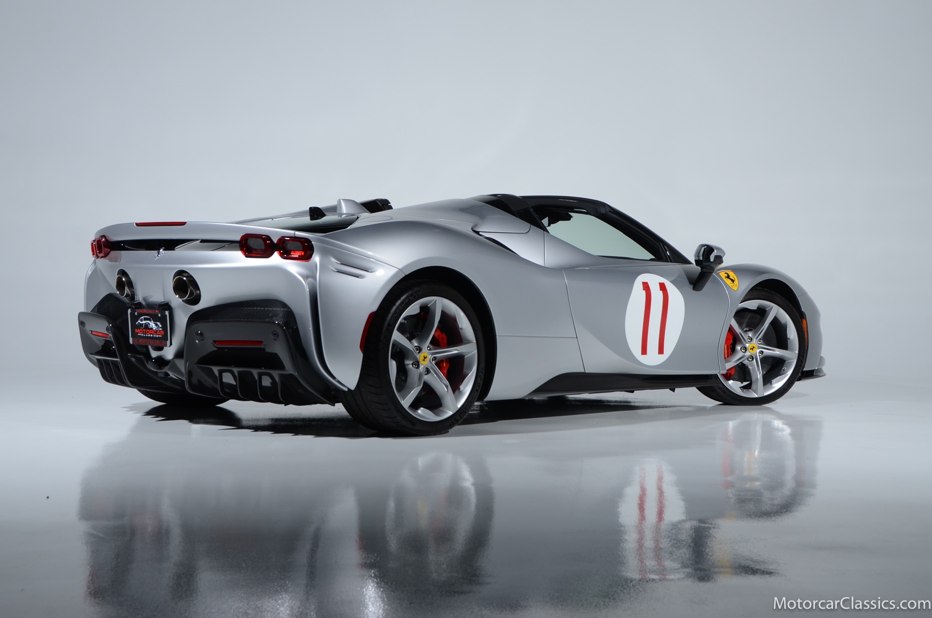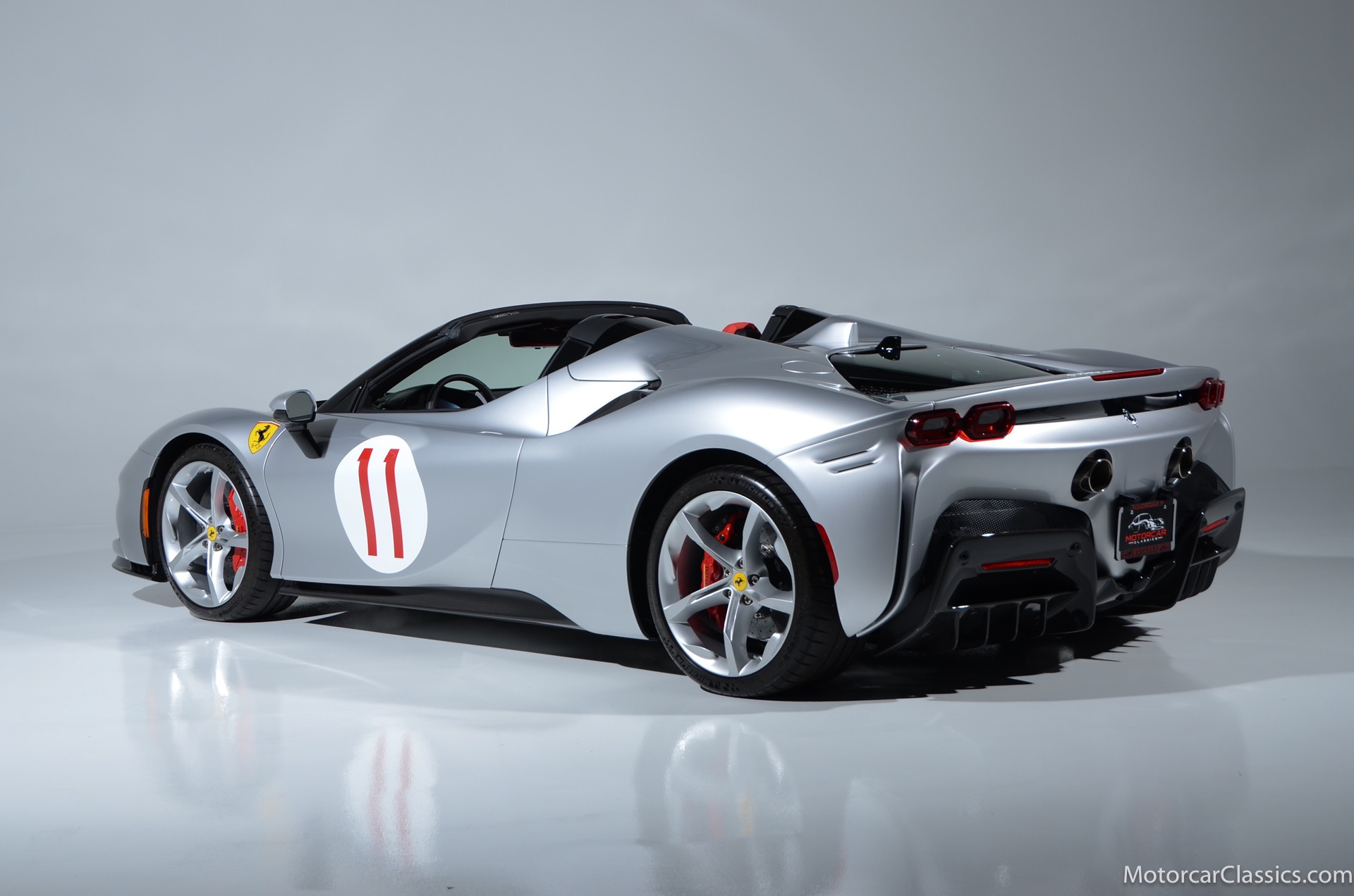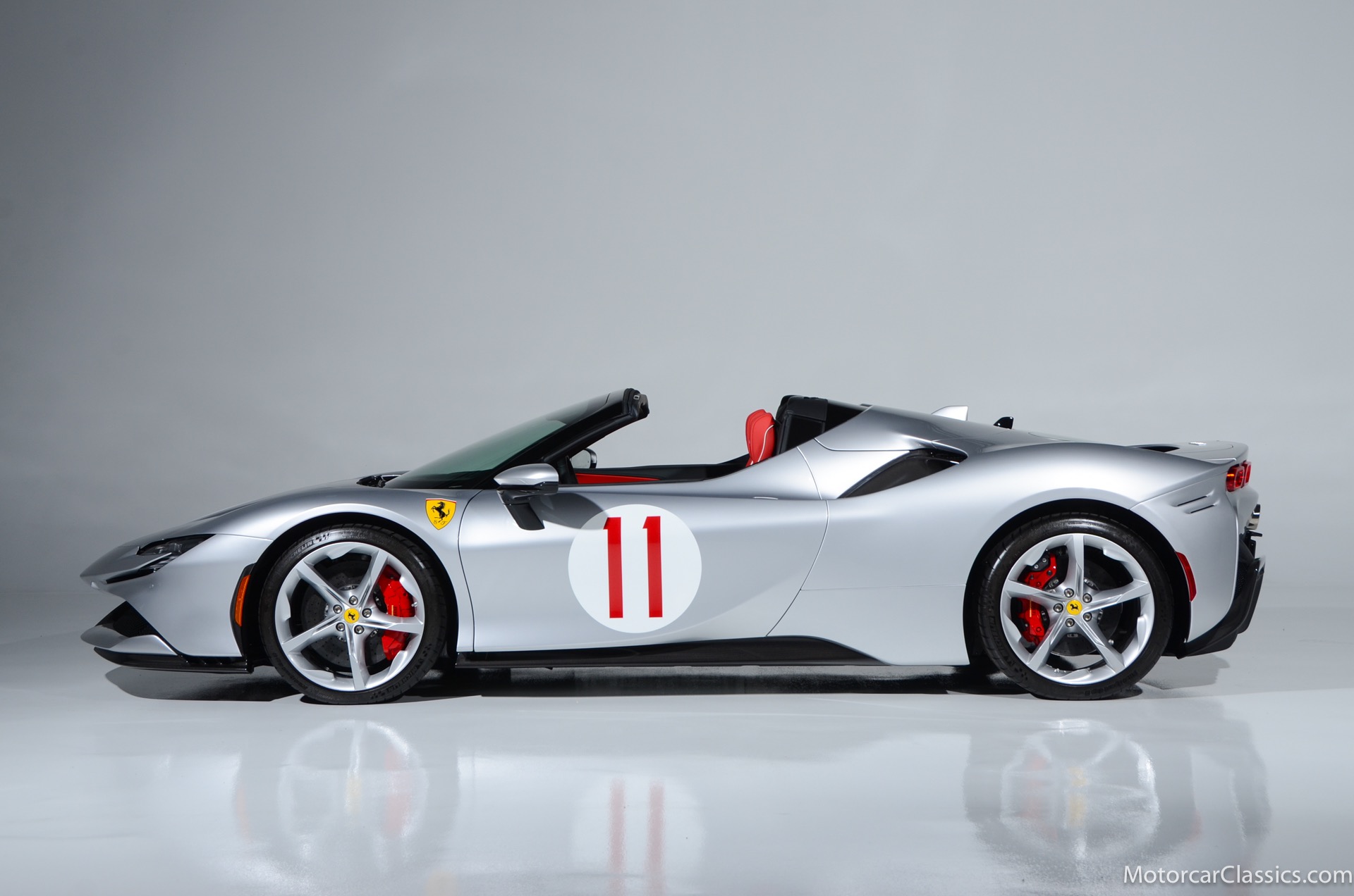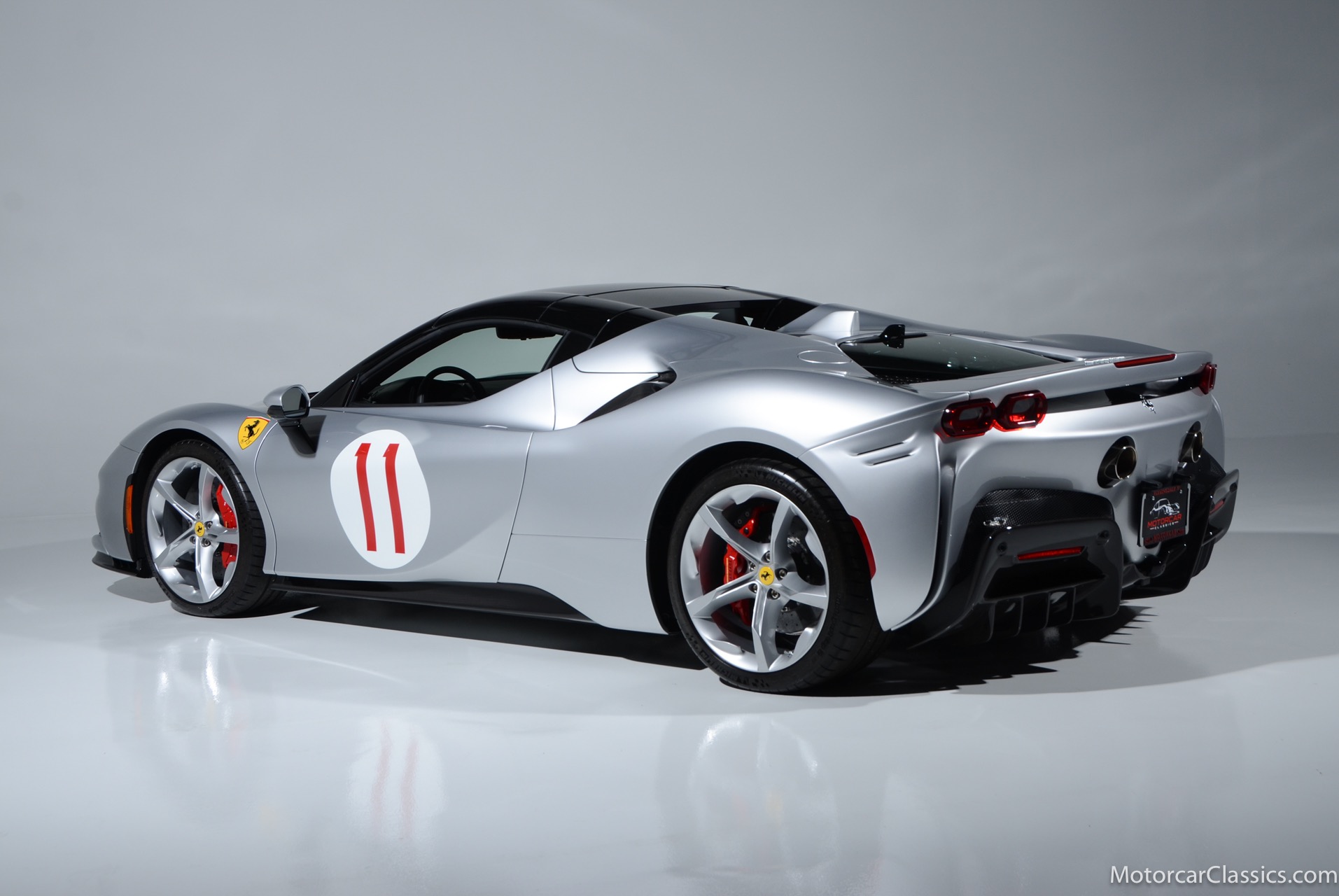 2022 Ferrari SF90 Spider for sale! Motorcar Classics is proud to present this one-of-one Tailor Made 2022 Ferrari SF90 Spider. This particular SF90 was tailored after the 1957 Ferrari 625 TRC and modeled to chassis number 0672MDTR. Finished in Argento Nurburgring with Biano white livery circles that go across the hood and both doors with the number 11. The interior is covered in Red leather with white piping and black accents. Behind the driver's seat is the 986HP Twin Turbo 3.9l V8 e4WD PHEV attached to a 8 speed F1 Dual clutch transmission with only 190 miles driven since new. Option include: AFS System America, Airbrushed logo, 2 side circles for livery, Back radar, Red brake calipers, Carbon fibre side air splitters, Carbon Fibre engine cover, Carbon fibre rear boot trim, Carbon fibre rear diffuser, Carbon fibre under door cover, Exterior sill kick in carbon, Suspension lift and an additional $108,760.00 in other options ( See photos with under hood plaque) Your Inspection is invited!