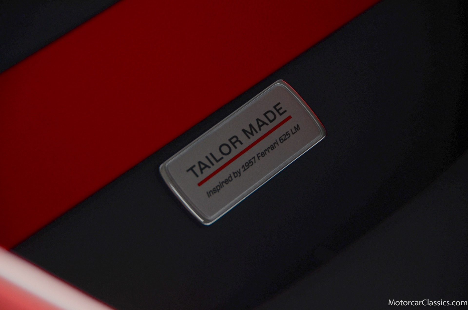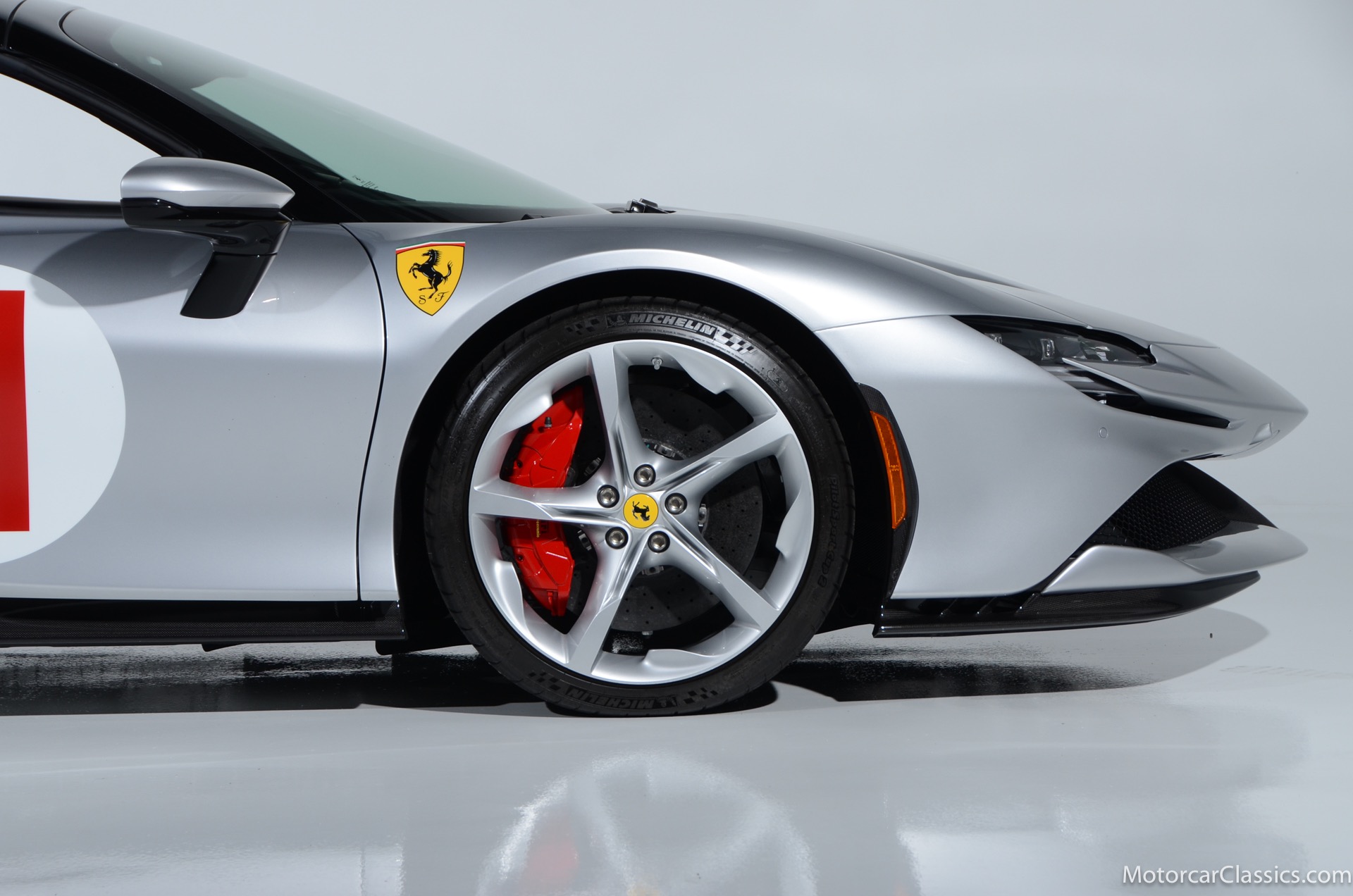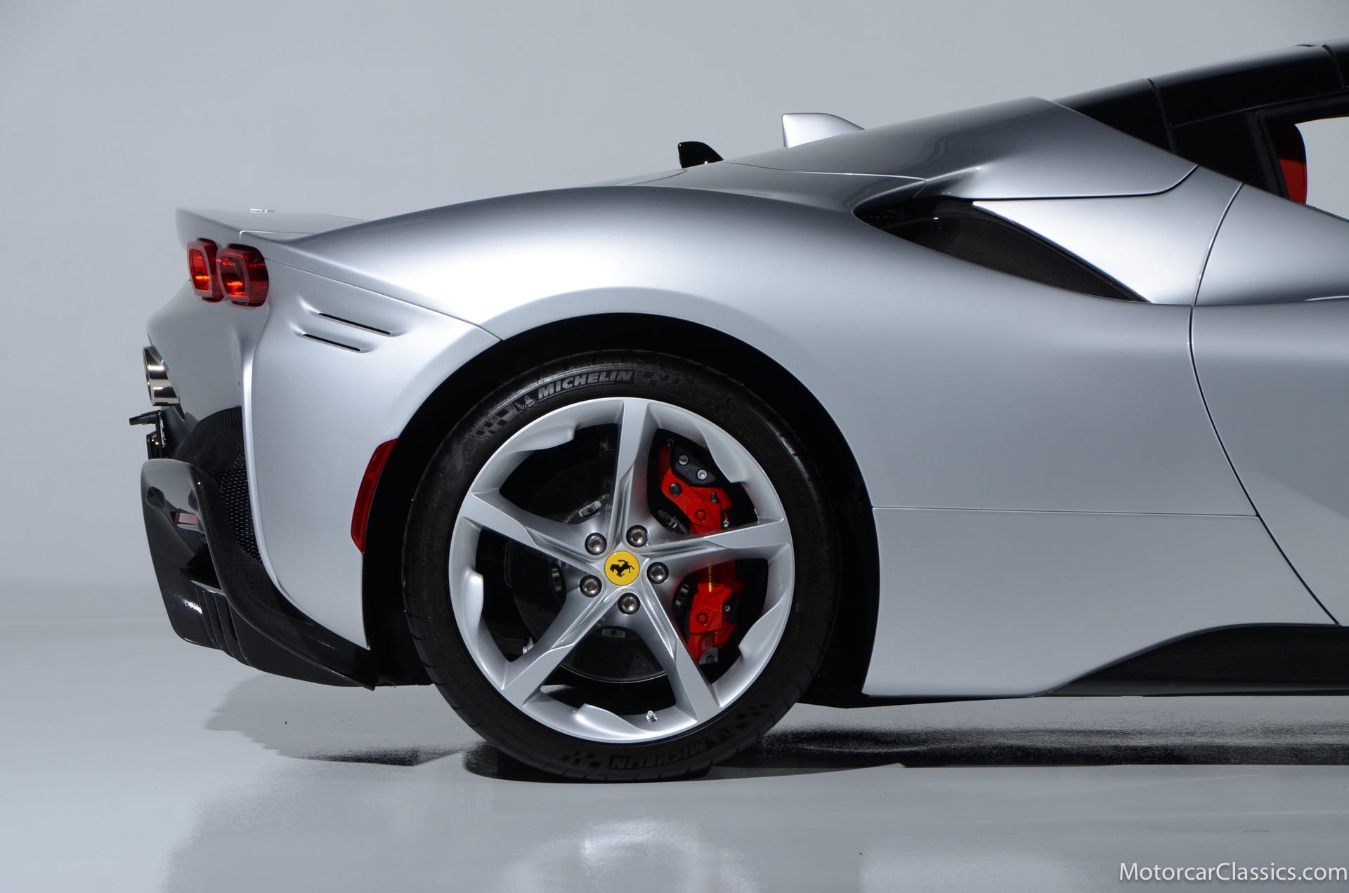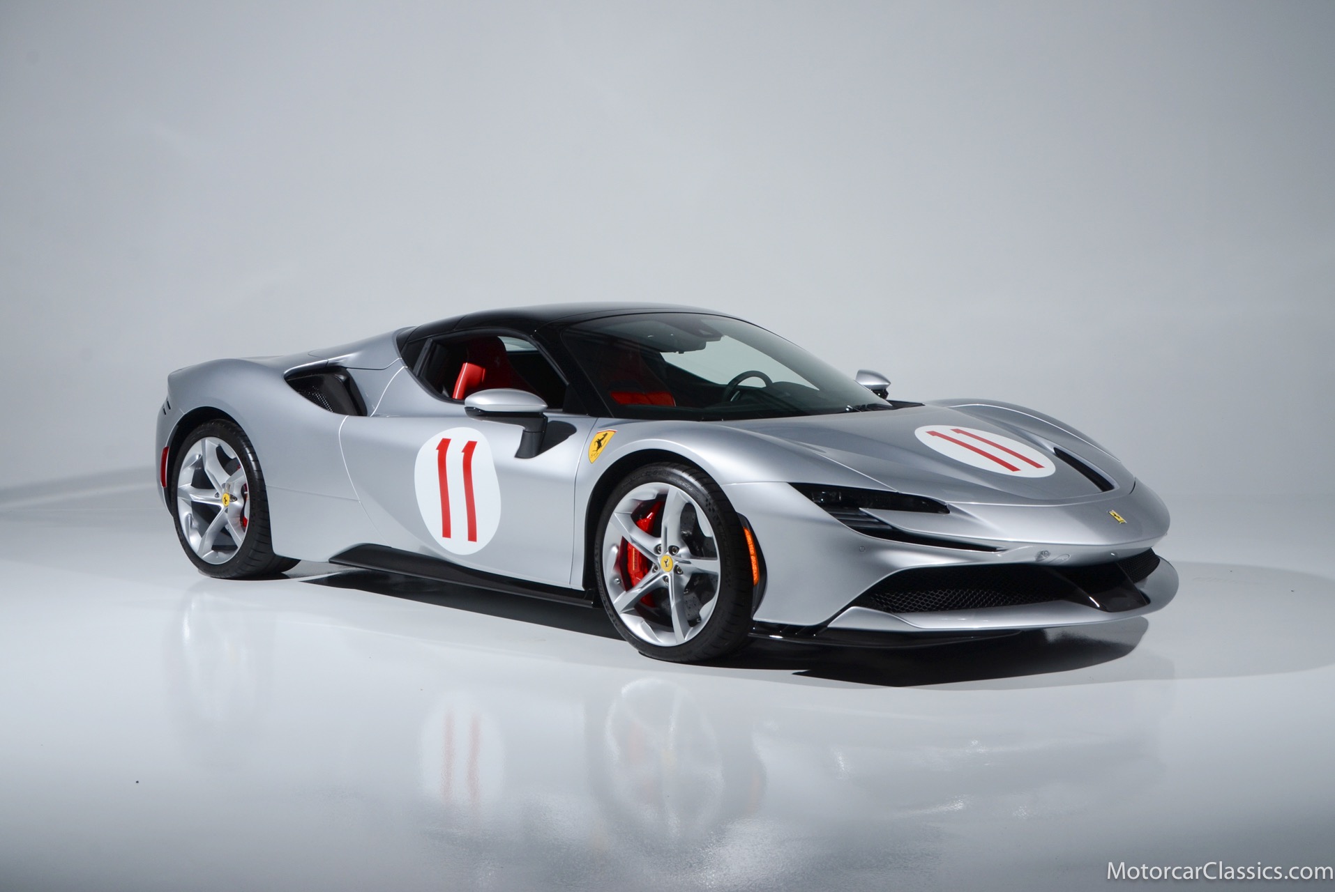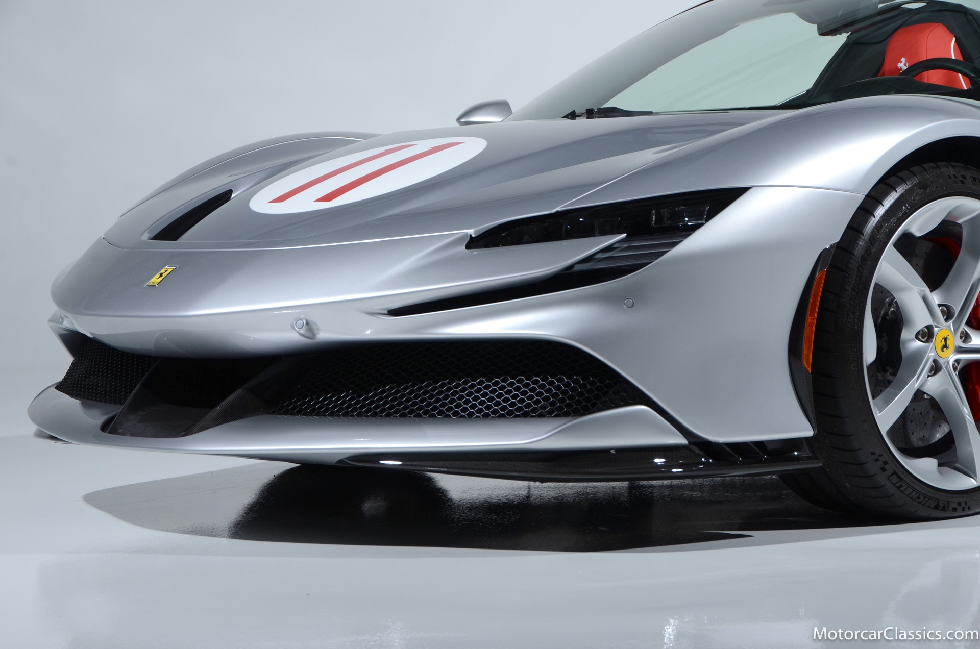 2022 Ferrari SF90 Spider for sale! Motorcar Classics is proud to present this one-of-one Tailor Made 2022 Ferrari SF90 Spider. This particular SF90 was tailored after the 1957 Ferrari 625 TRC and modeled to chassis number 0672MDTR. Finished in Argento Nurburgring with Biano white livery circles that go across the hood and both doors with the number 11. The interior is covered in Red leather with white piping and black accents. Behind the driver's seat is the 986HP Twin Turbo 3.9l V8 e4WD PHEV attached to a 8 speed F1 Dual clutch transmission with only 190 miles driven since new. Option include: AFS System America, Airbrushed logo, 2 side circles for livery, Back radar, Red brake calipers, Carbon fibre side air splitters, Carbon Fibre engine cover, Carbon fibre rear boot trim, Carbon fibre rear diffuser, Carbon fibre under door cover, Exterior sill kick in carbon, Suspension lift and an additional $108,760.00 in other options ( See photos with under hood plaque) Your Inspection is invited!