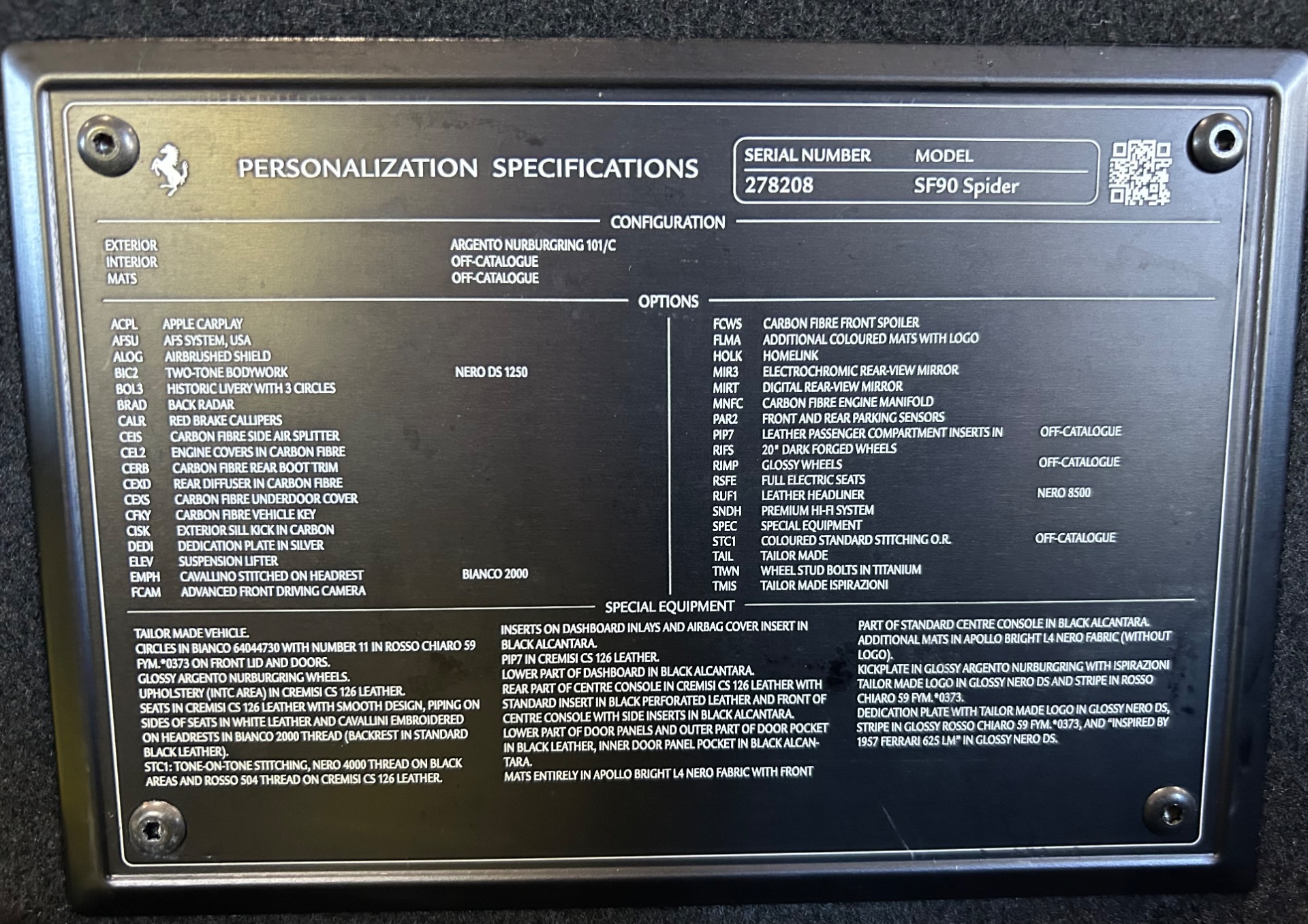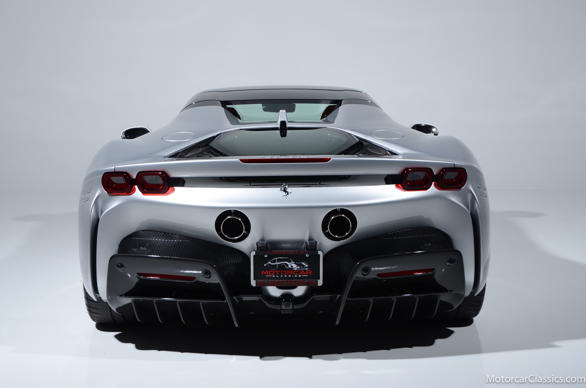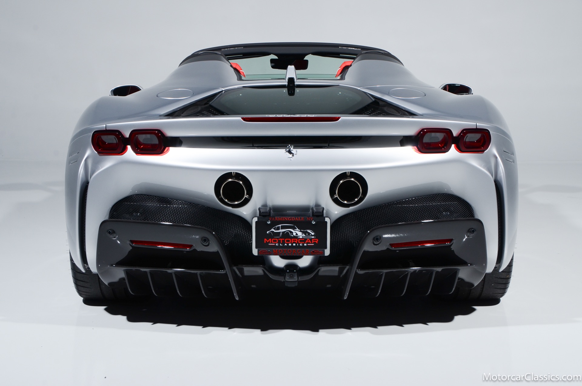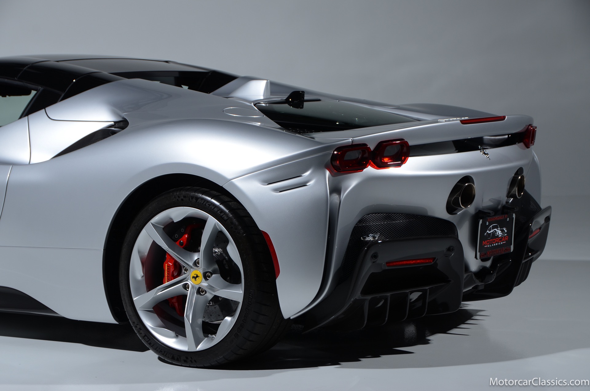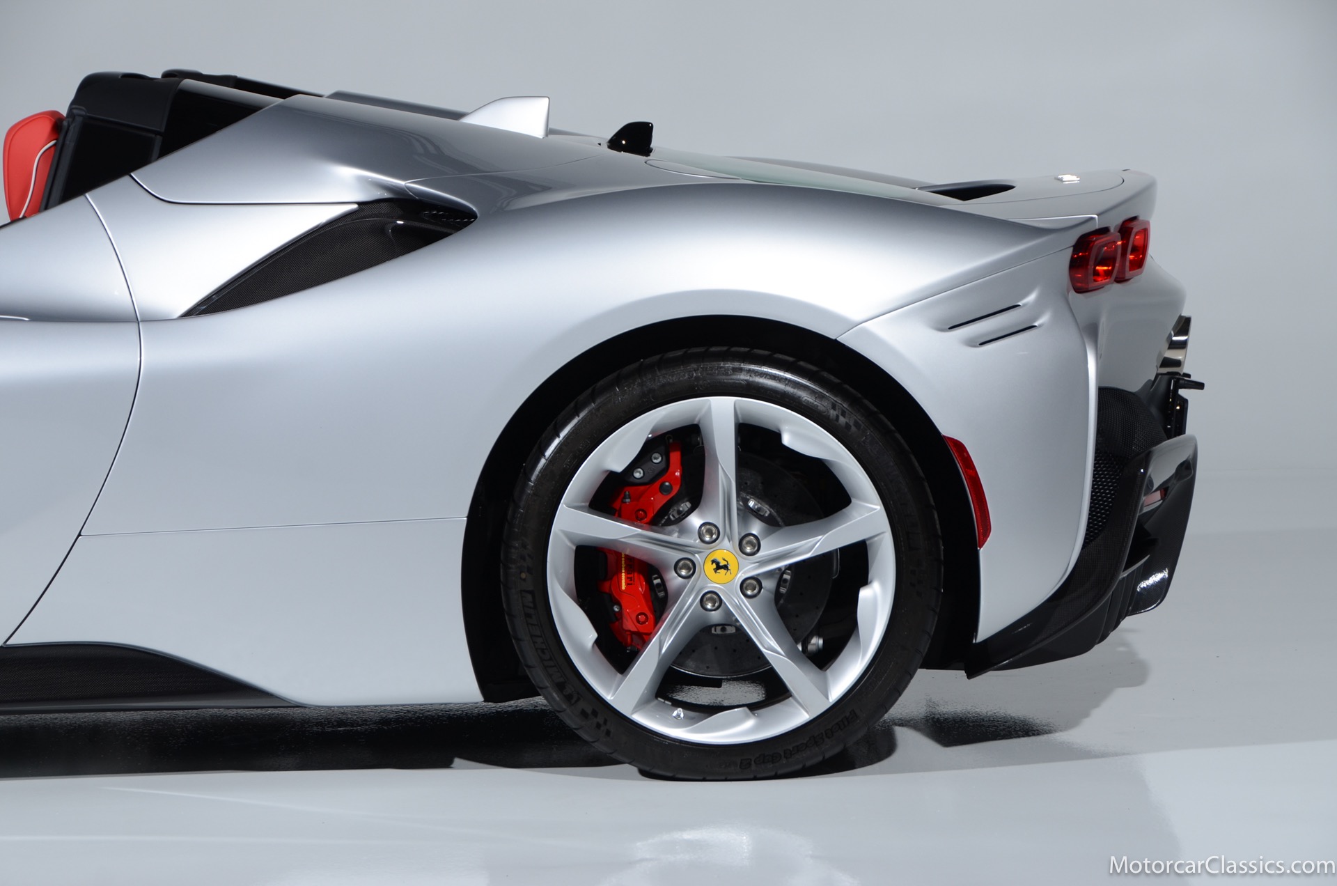 2022 Ferrari SF90 Spider for sale! Motorcar Classics is proud to present this one-of-one Tailor Made 2022 Ferrari SF90 Spider. This particular SF90 was tailored after the 1957 Ferrari 625 TRC and modeled to chassis number 0672MDTR. Finished in Argento Nurburgring with Biano white livery circles that go across the hood and both doors with the number 11. The interior is covered in Red leather with white piping and black accents. Behind the driver's seat is the 986HP Twin Turbo 3.9l V8 e4WD PHEV attached to a 8 speed F1 Dual clutch transmission with only 190 miles driven since new. Option include: AFS System America, Airbrushed logo, 2 side circles for livery, Back radar, Red brake calipers, Carbon fibre side air splitters, Carbon Fibre engine cover, Carbon fibre rear boot trim, Carbon fibre rear diffuser, Carbon fibre under door cover, Exterior sill kick in carbon, Suspension lift and an additional $108,760.00 in other options ( See photos with under hood plaque) Your Inspection is invited!
