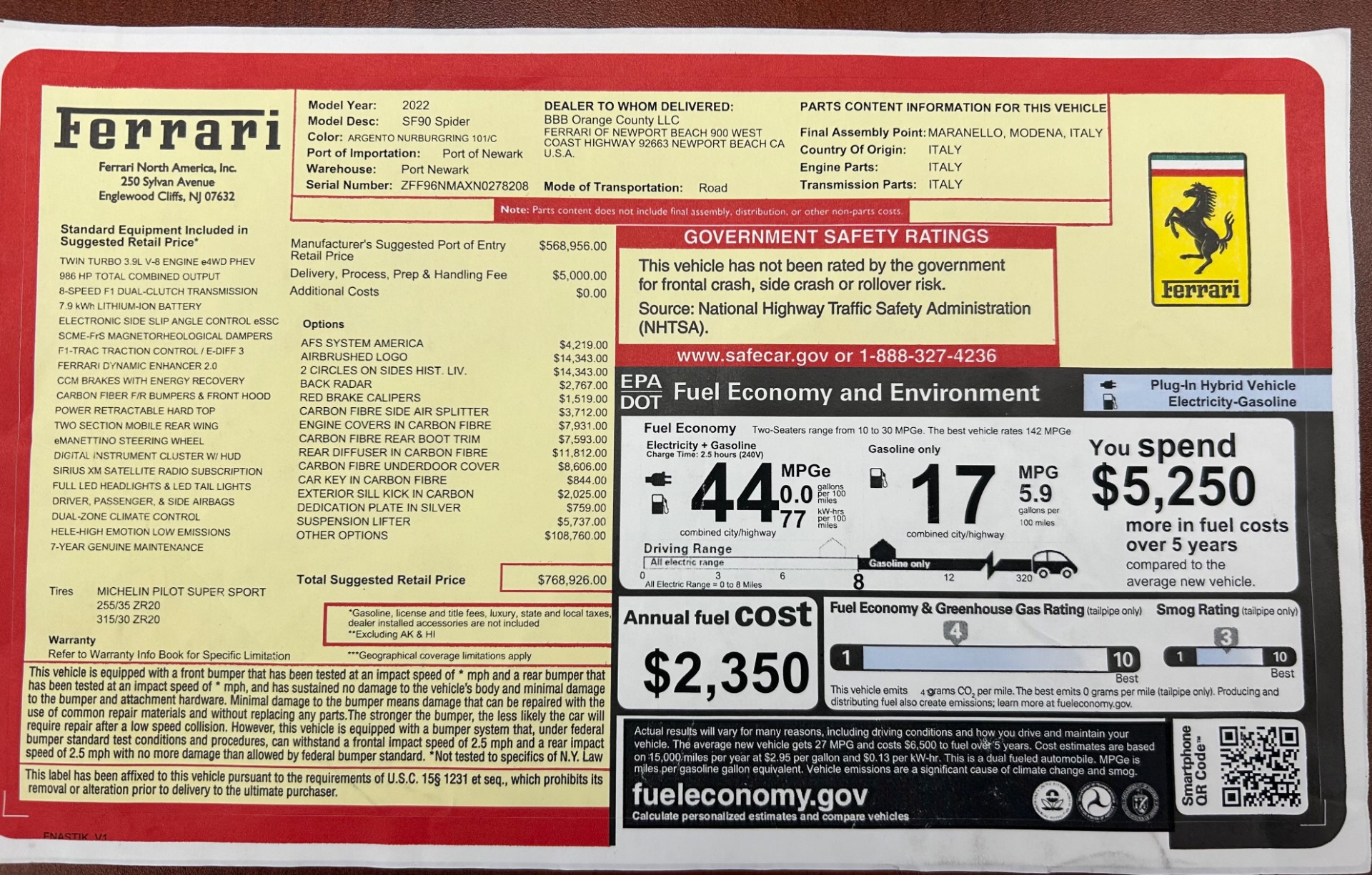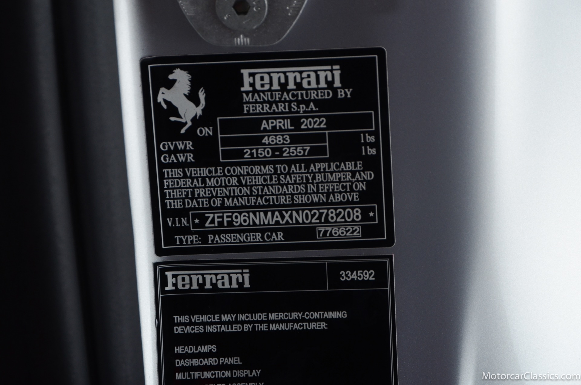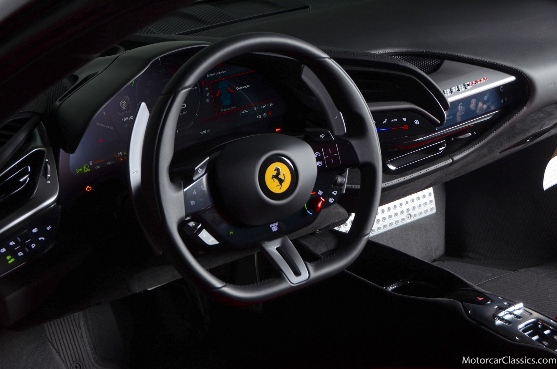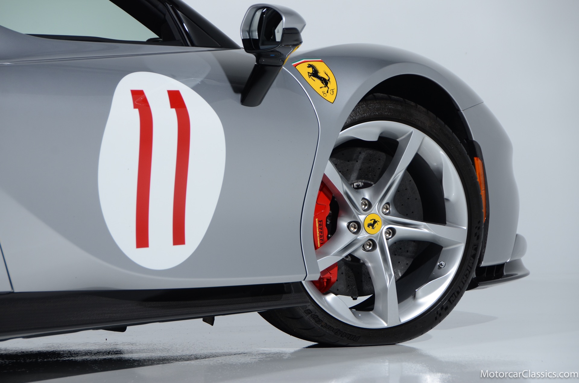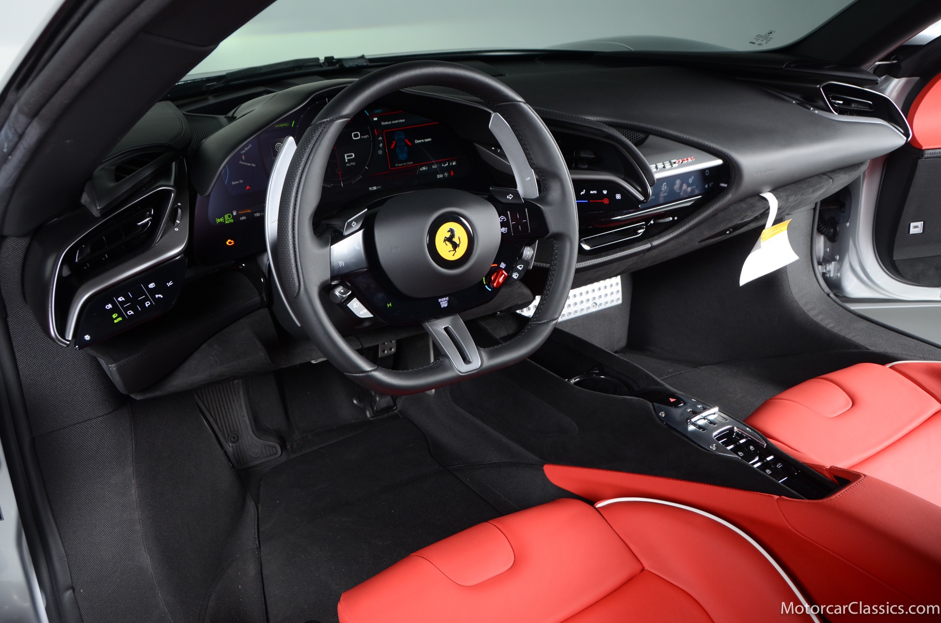 2022 Ferrari SF90 Spider for sale! Motorcar Classics is proud to present this one-of-one Tailor Made 2022 Ferrari SF90 Spider. This particular SF90 was tailored after the 1957 Ferrari 625 TRC and modeled to chassis number 0672MDTR. Finished in Argento Nurburgring with Biano white livery circles that go across the hood and both doors with the number 11. The interior is covered in Red leather with white piping and black accents. Behind the driver's seat is the 986HP Twin Turbo 3.9l V8 e4WD PHEV attached to a 8 speed F1 Dual clutch transmission with only 190 miles driven since new. Option include: AFS System America, Airbrushed logo, 2 side circles for livery, Back radar, Red brake calipers, Carbon fibre side air splitters, Carbon Fibre engine cover, Carbon fibre rear boot trim, Carbon fibre rear diffuser, Carbon fibre under door cover, Exterior sill kick in carbon, Suspension lift and an additional $108,760.00 in other options ( See photos with under hood plaque) Your Inspection is invited!