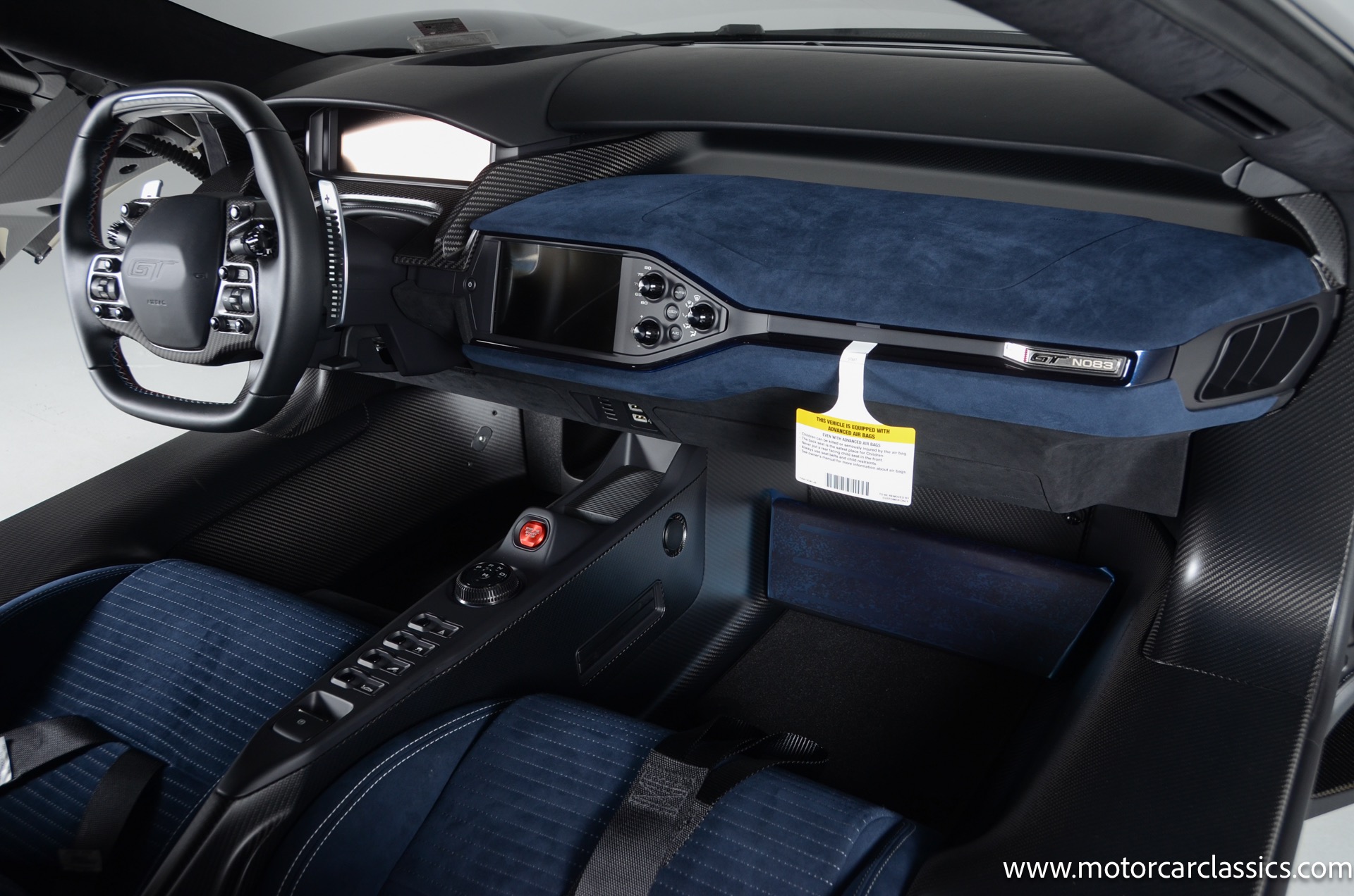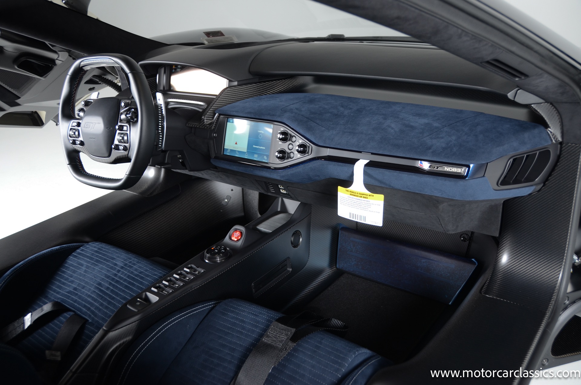 Inside, the driver-focused cockpit features a digital instrument cluster, a 6.5-inch touchscreen with Sync 3 software, and a race-inspired steering wheel with integrated controls. The fixed seating position with adjustable pedals and steering wheel provides a true race car experience. Exterior highlights include butterfly doors, 20-inch forged alloy wheels (with optional full carbon fiber wheels), and carbon ceramic brakes.