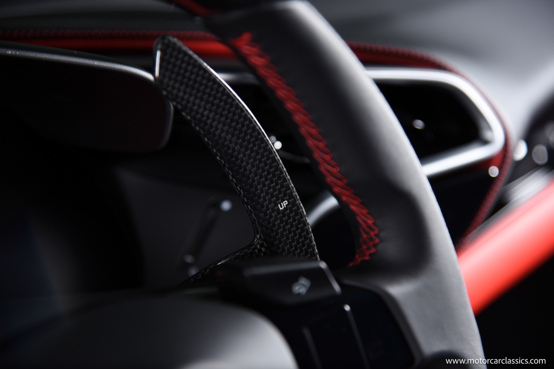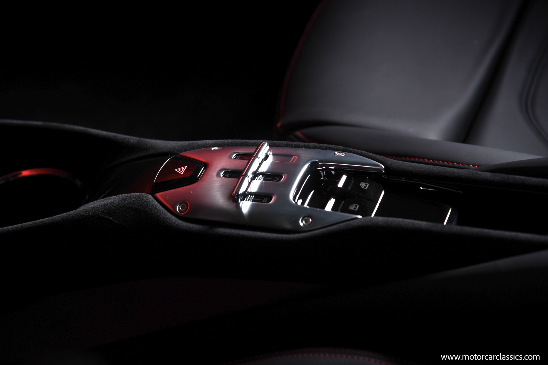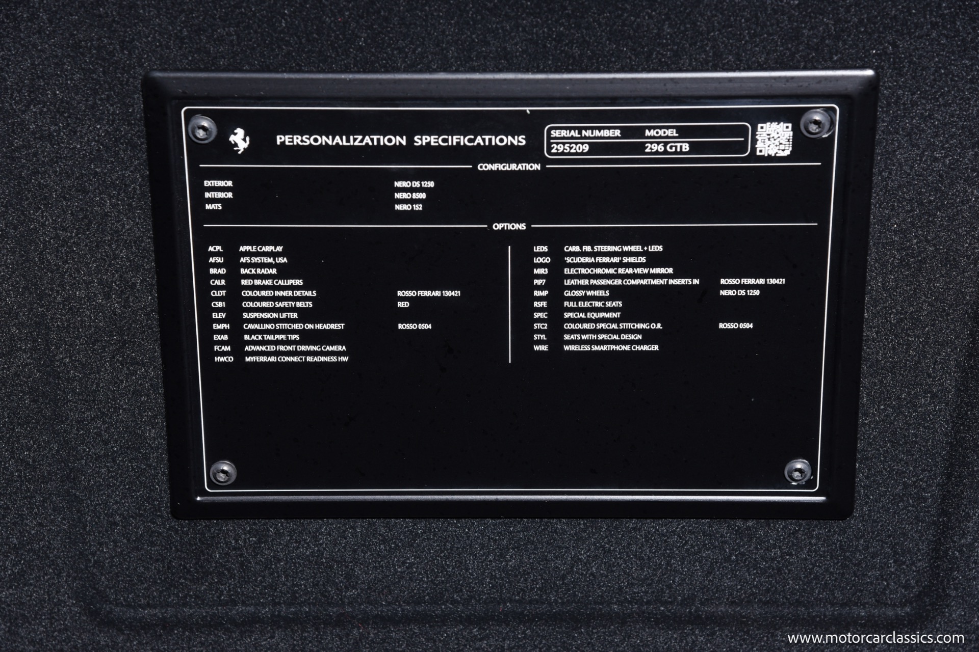 This 296 GTB boasts a highly desirable configuration, beginning with glossy painted rims, red brake calipers, and the unmistakable Scuderia Ferrari shields on the fenders. The rear is further enhanced with black ceramic exhaust pipes, while the front radar adds an extra layer of technology and convenience. Inside, the cabin is a masterclass in Ferrari craftsmanship, highlighted by nero leather with red inserts, colored inner details, and special colored stitching, along with red safety belts and the legendary prancing horse stitched into the headrests. Comfort is ensured through full electric seats, while the electrochromic rearview mirror adds modern sophistication.