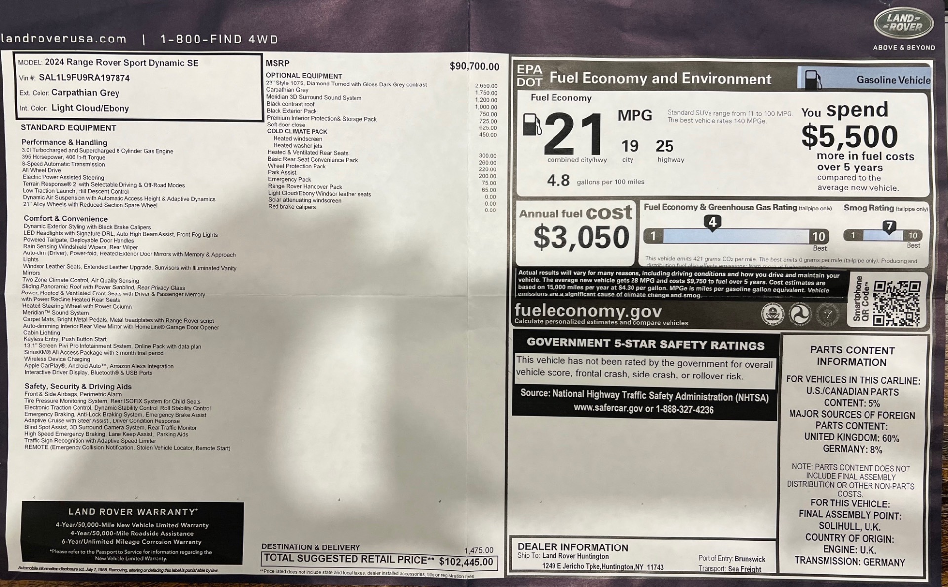 2024 Land Rover Range Rover Sport P400 Dynamic SE for sale! Motorcar Classics is pleased to offer this Range Rover Sport presented in Carpathian Grey with Light Cloud/Ebony interior. 1-Owner clean Carfax with only 9,145 miles! 3.0L turbocharged and supercharged 6 cylinder motor with 395 HP. 8-speed automatic transmission. Tire/Wheel and Keyfob warranty ($3,495) is active on this car and transferable with a private sale option along with a Crystal Fusion interior/exterior and windshield protection warranty ($2995). Options include: 23 style 1075 Diamond turned with gloss dark grey contrast wheels, Meridian 3d surround sound system, black contrast roof, black exterior pack, premium interior protection and storage pack, soft door close, cold climate pack, heated windscreen, heated washer jets, heated and ventilated rear seats, basic rear seat convenience pack, wheel protection pack, park assist, emergency pack, range rover handover pack, solar attenuating windscreen, red brake calipers and more! $102,445 MSRP!